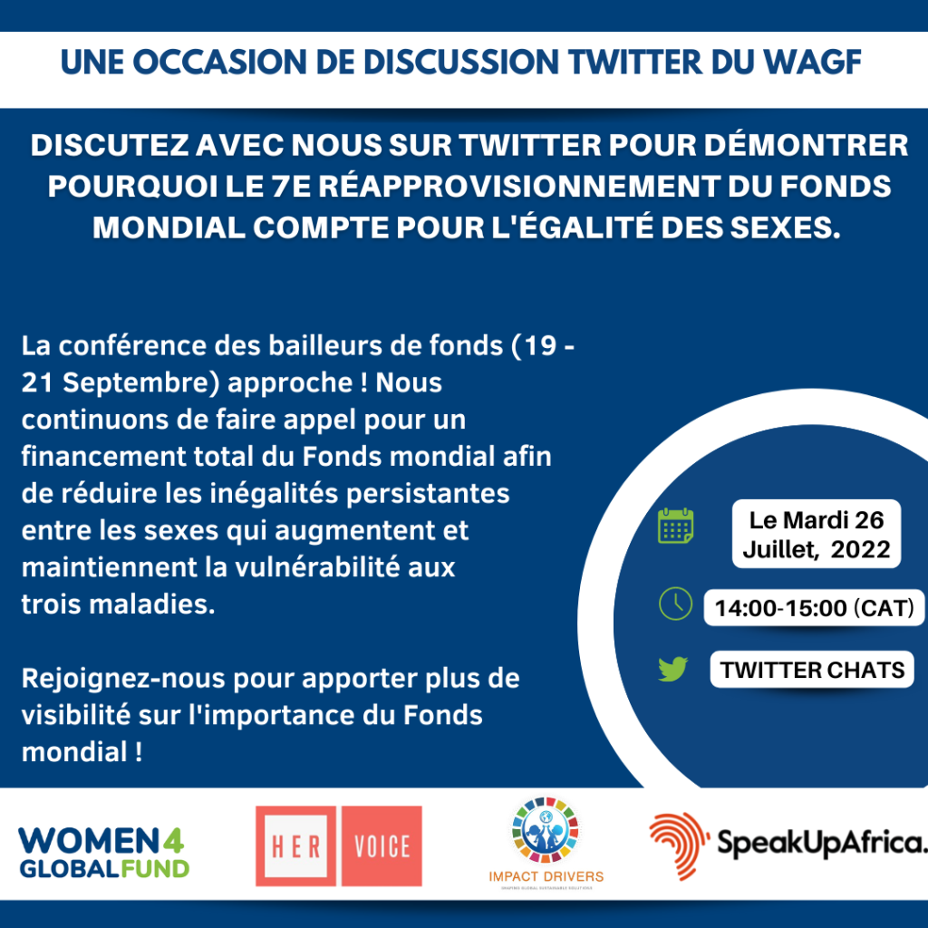 Rejoignez W4GF en collaboration avec HER Voice Fund, Impact Drivers et Speak Up Africa le Mardi 26 Juillet, 2022 pour une session de chat sur Twitter, pour attirer l’attention sur pourquoi le 7e Réapprovisionnement du Fonds Mondial compte pour L ‘égalité des sexes.