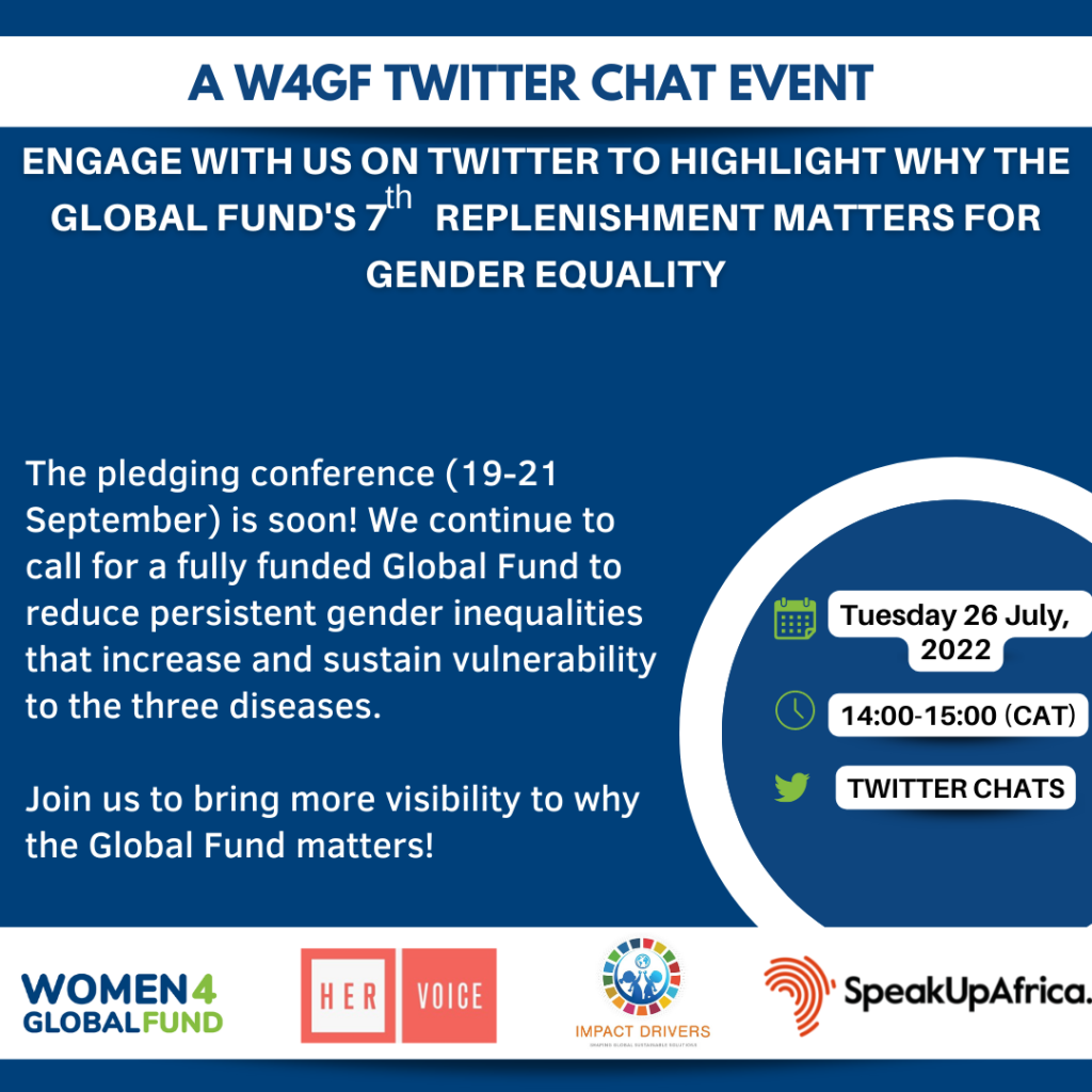 Join W4GF in collaboration with HER Voice Fund, Impact Drivers and Speak Up Africa on Tuesday 26 July, 2022 for a Twitter chat session, as we highlight why the Global Fund’s 7th replenishment matters for gender equality.