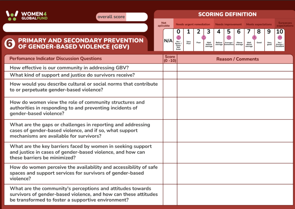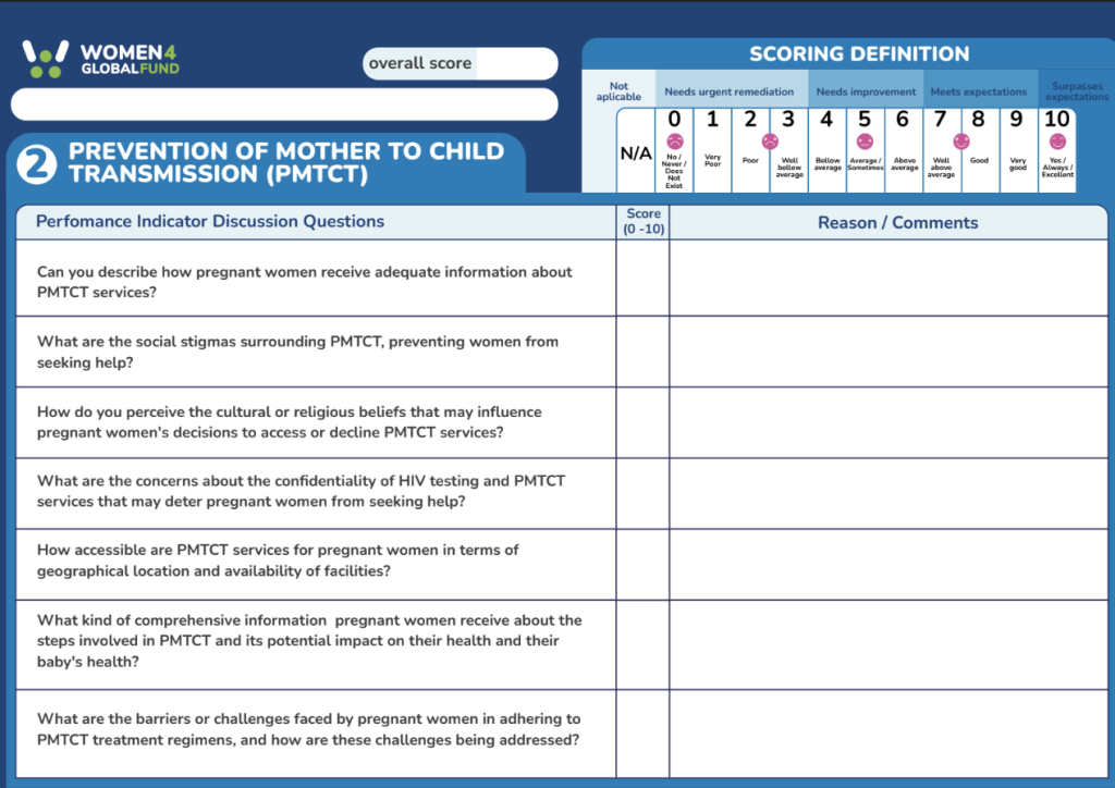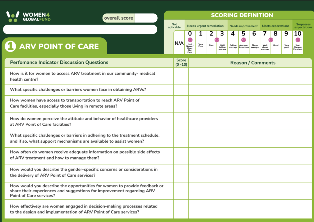 A scorecard for Community-Led Monitoring is a tool that allows community members to systematically assess and track the performance of specific activities, programmes, or services. It typically includes qualitative questions and indicators that help measure the programme’s impact, effectiveness, and quality. The scorecard is a way to collect and organise data that can be used for analysis, advocacy, and decision-making in the Global Fund programmes.